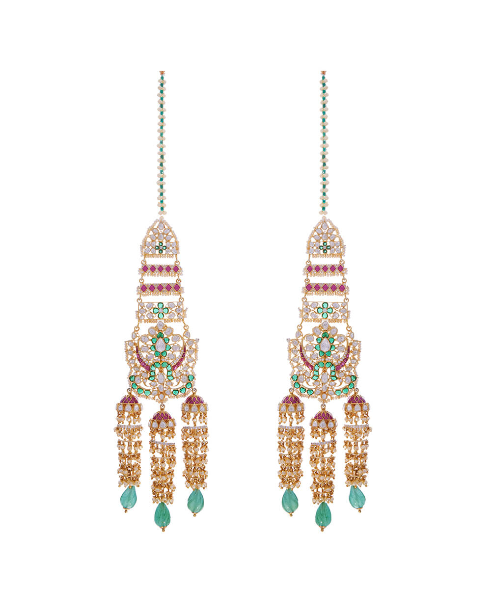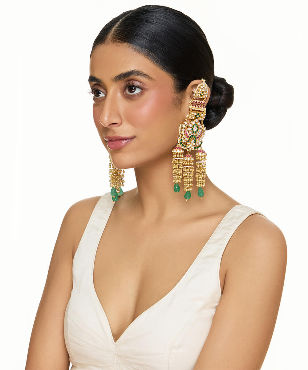 USP/Features: Made in silver alloy with micron gold plating, these earrings feature polki, cubic zirconia, green bead drops, Gilson and emerald accents, and cascading tassels—crafted using the talaf technique.