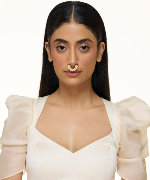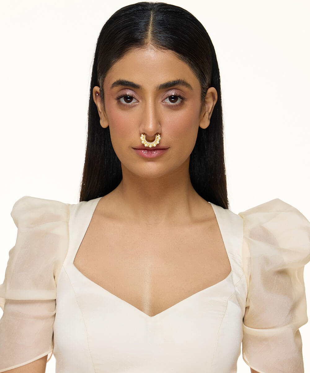 USP/Features: Made in sterling silver with micron gold plating, this septum ring features cubic zirconia and a vivid green stone. Available in two styles—with emerald beads or pearl drops.