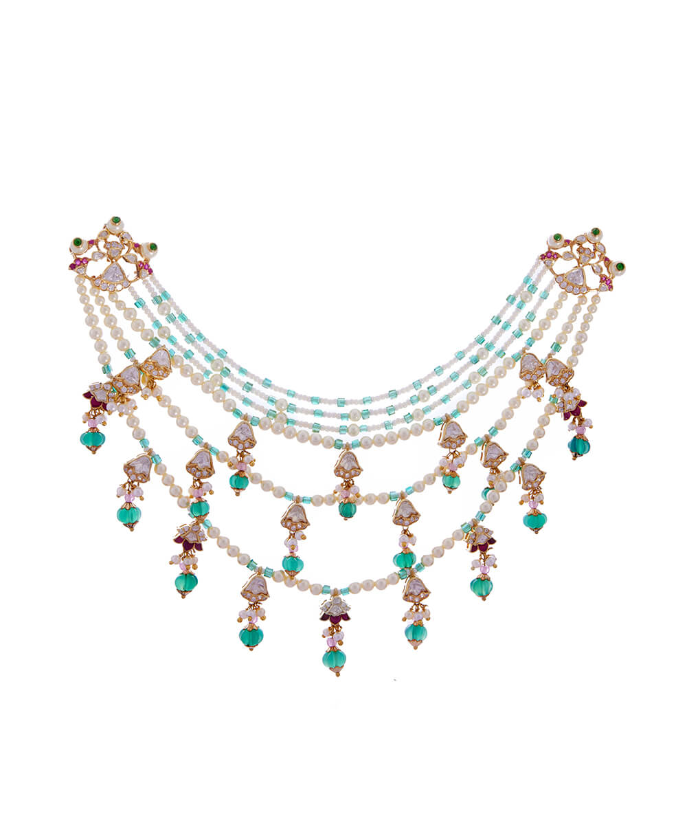 USP/Features: Made in silver alloy with micron gold plating, this hair accessory features pearl strands, pink gemstone drops, floral accents, polki, cubic zirconia, and green melon-cut beads.