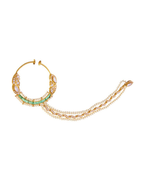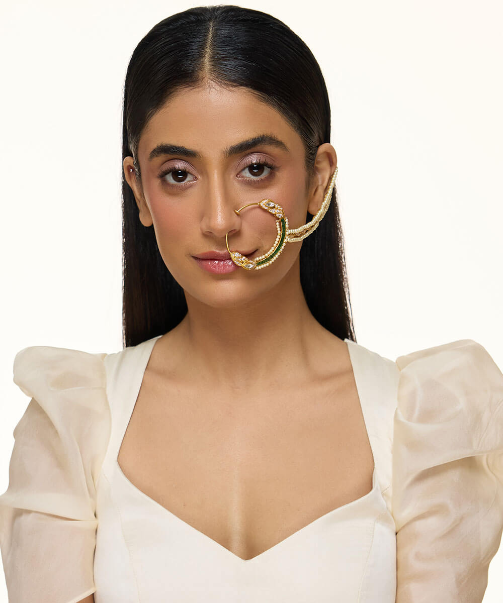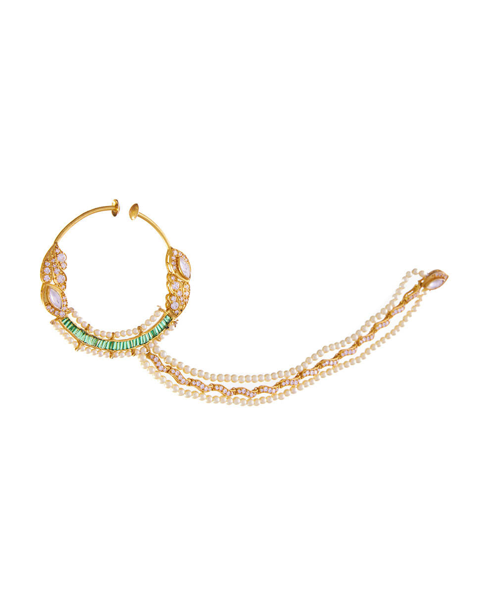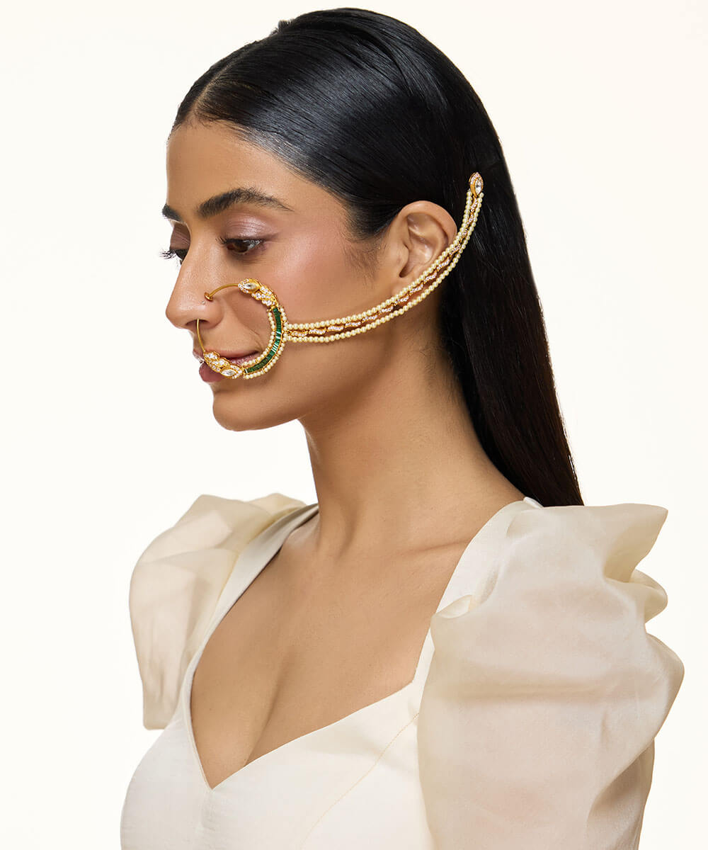 USP/Features: Made in sterling silver with micron gold plating, this Nath features polki, emeralds, cubic zirconia, and pearl beading.
