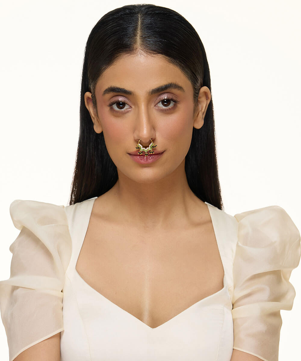 USP/Features: Made in sterling silver with micron gold plating, this septum ring features green meenakari, cubic zirconia, and hanging elements.