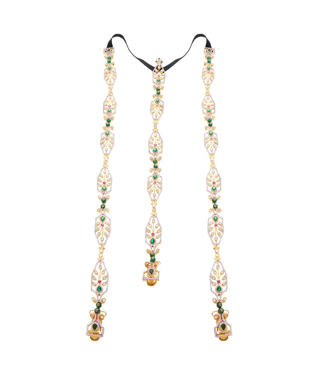 Story Inspiration: Inspired by royal court adornments, Majesty reimagines traditional Indian craftsmanship through a modern lens. Each element – from the melon-cut green stones to the pear-shaped pearl drop-evokes timeless splendor, anchored by our signature monogram and rich tomato leather.
