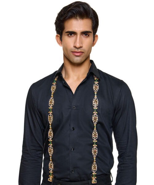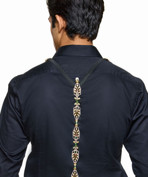 USP/Features: Majesty suspendors are crafted in silver alloy and finished with tomato leather. They feature opals, rubies, Polki, cubic zirconia, melon-cut green stones, and a pearl drop-complete with our signature monogram
