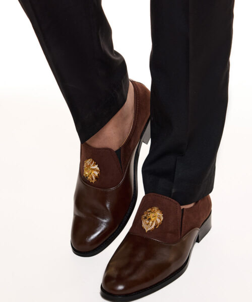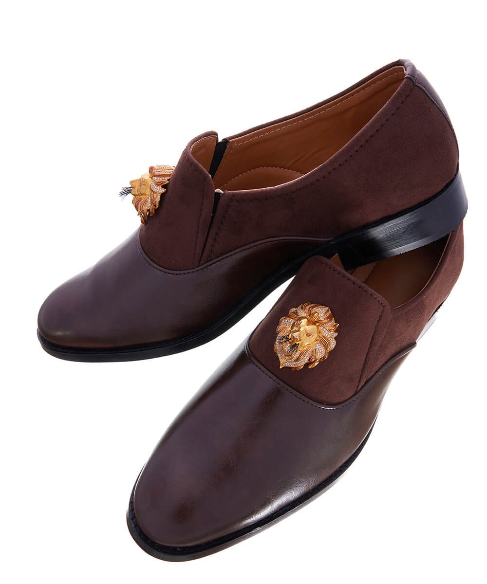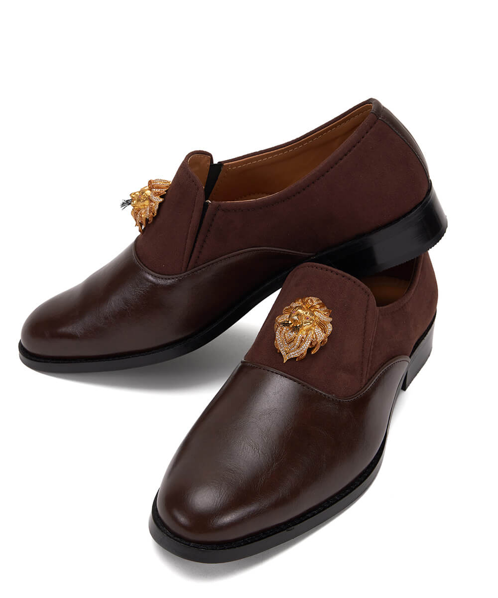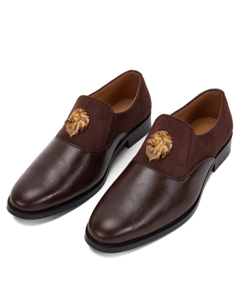 Elegant Loafer for groom, these brown loafer Made in premium synthetic leather(PU), each pair features a lion-head monogram in sterling silver with micron gold plating. A refined choice for ceremonial moments and beyond