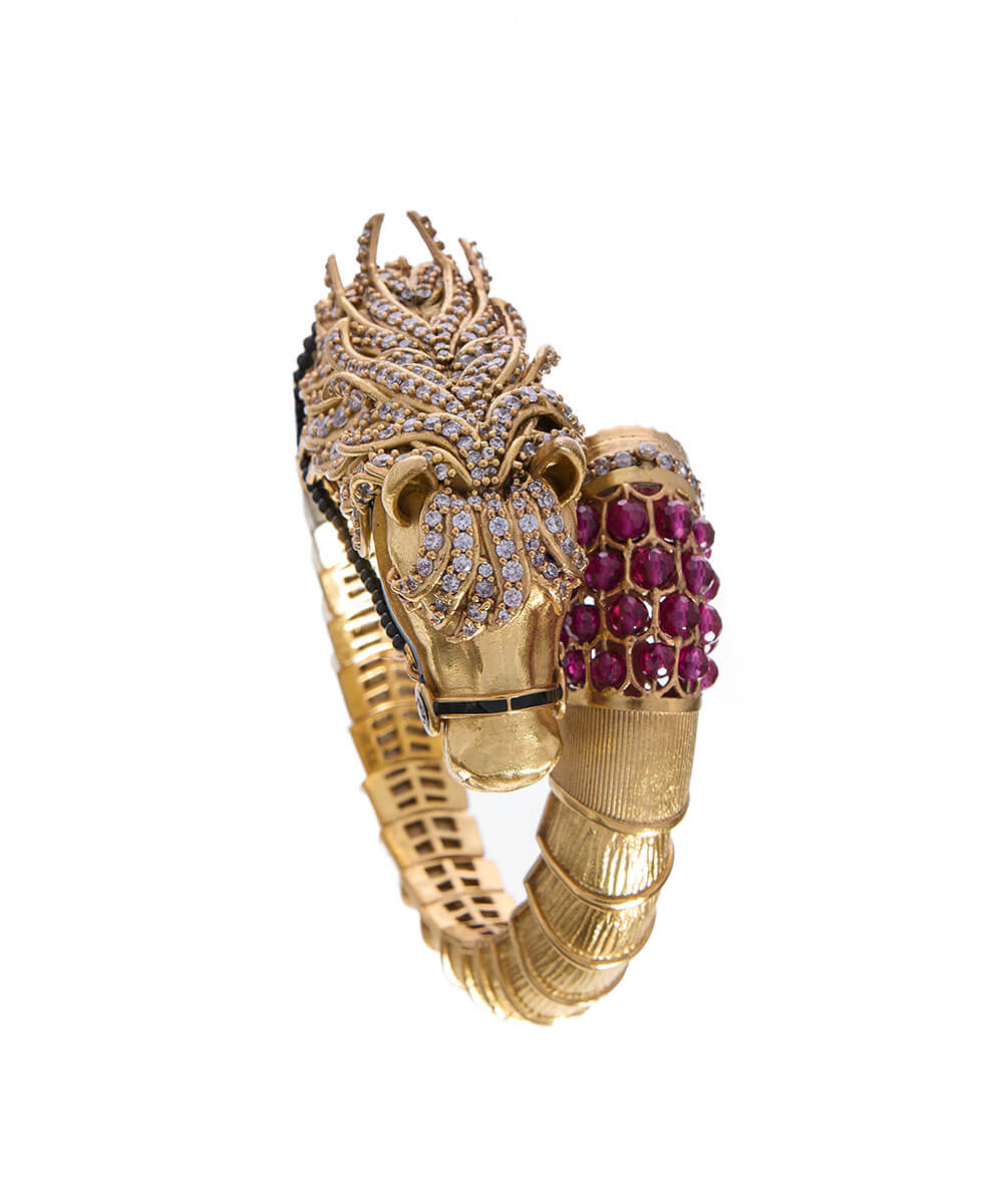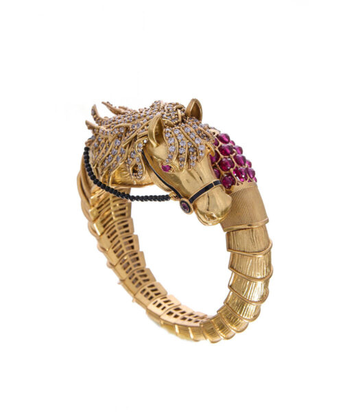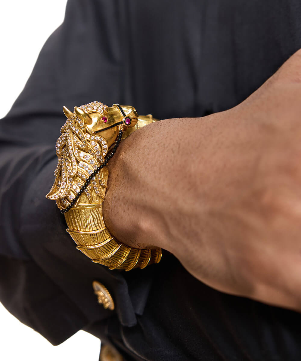 USP/Features: Made in silver alloy with 1 micron gold plating, this bangle features horse motifs, enamelling, cubic zirconia, ruby beads, black beads, and our monogram.