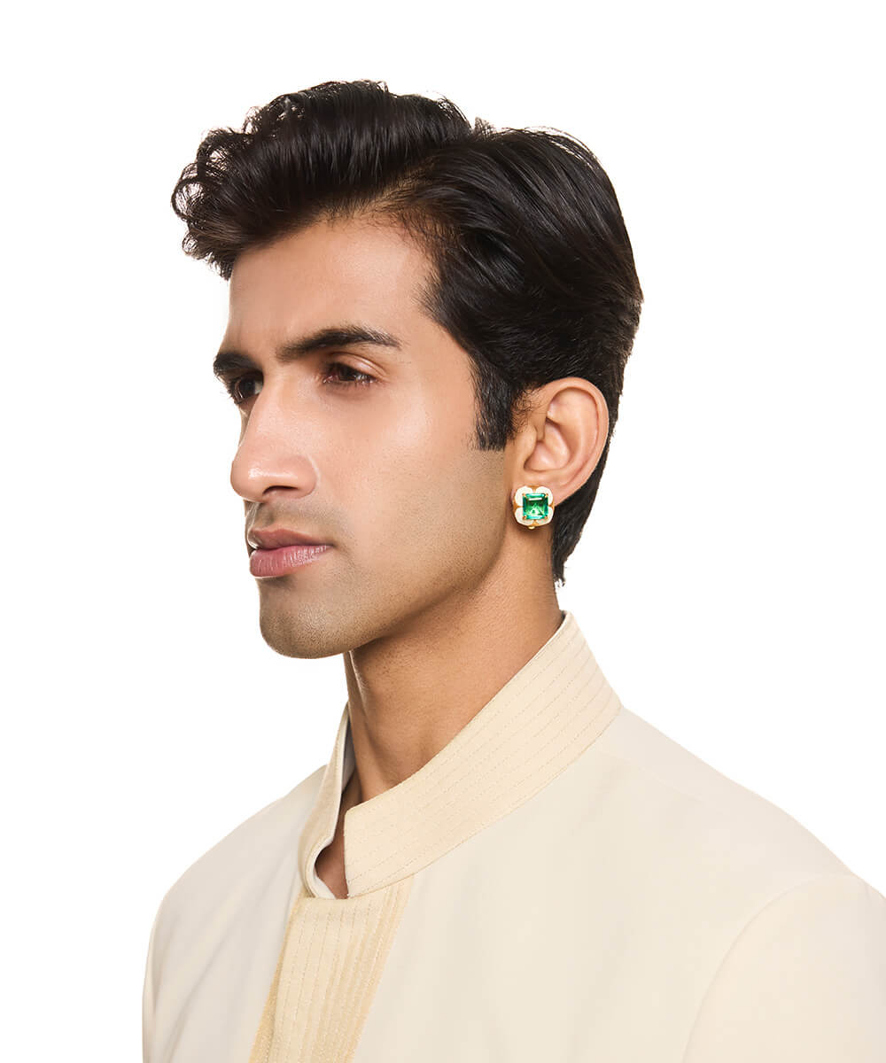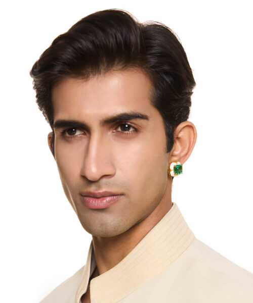 Traditional groom earrings with white meenakari detailing and cushion-cut green stones?crafted for a legacy of elegance and artistry.