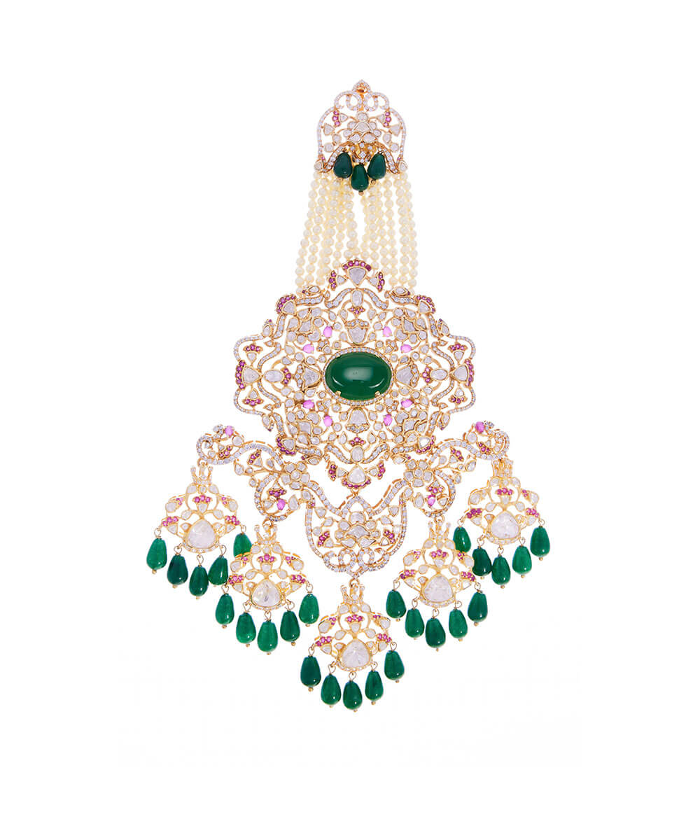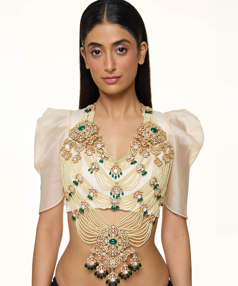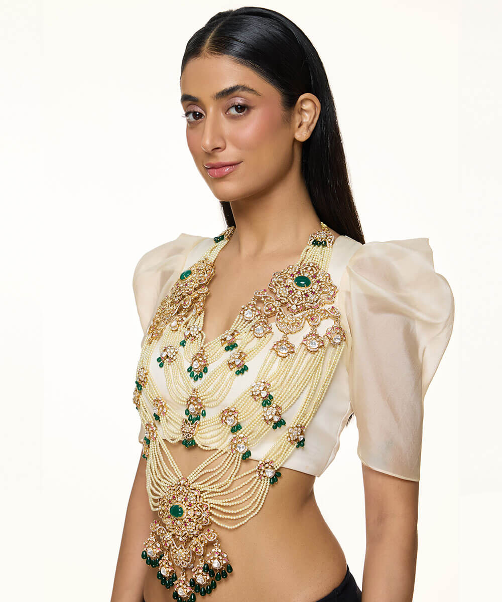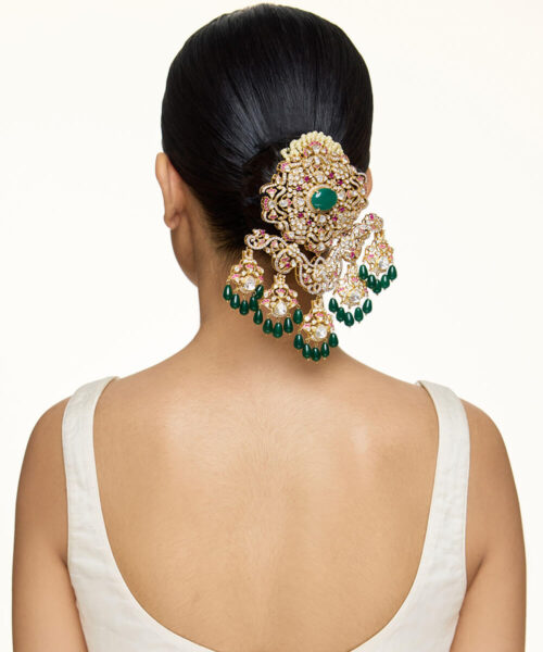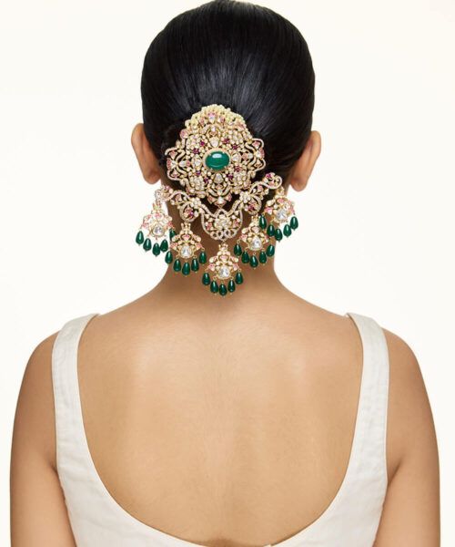 USP/Features: Made in sterling silver with micron gold plating, this necklace features a central emerald, polki, rubies, cubic zirconia, pearl strings, and a detachable design that converts into a passa or bun accessory.