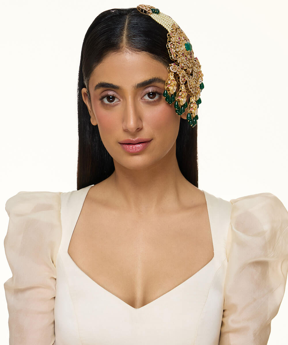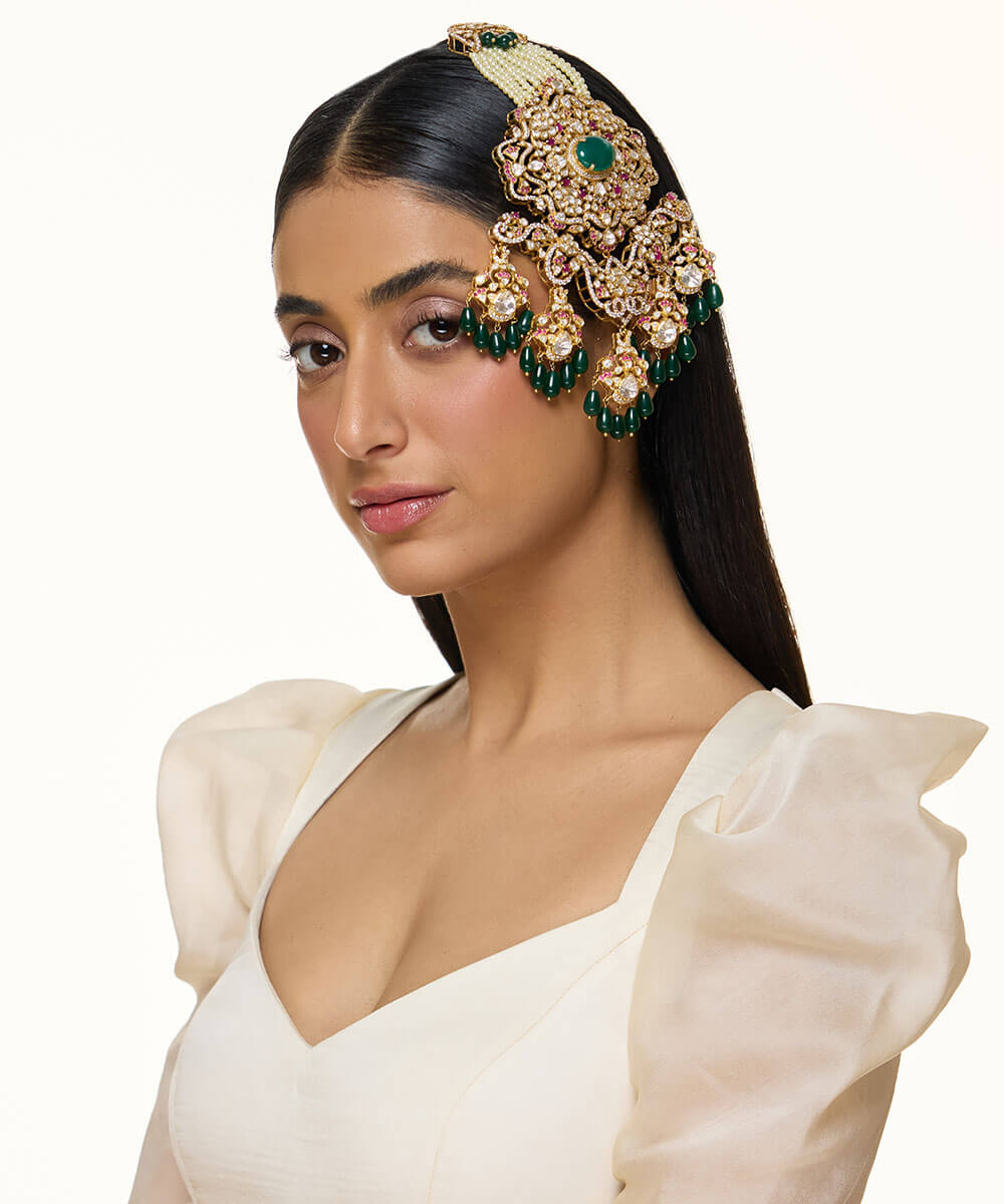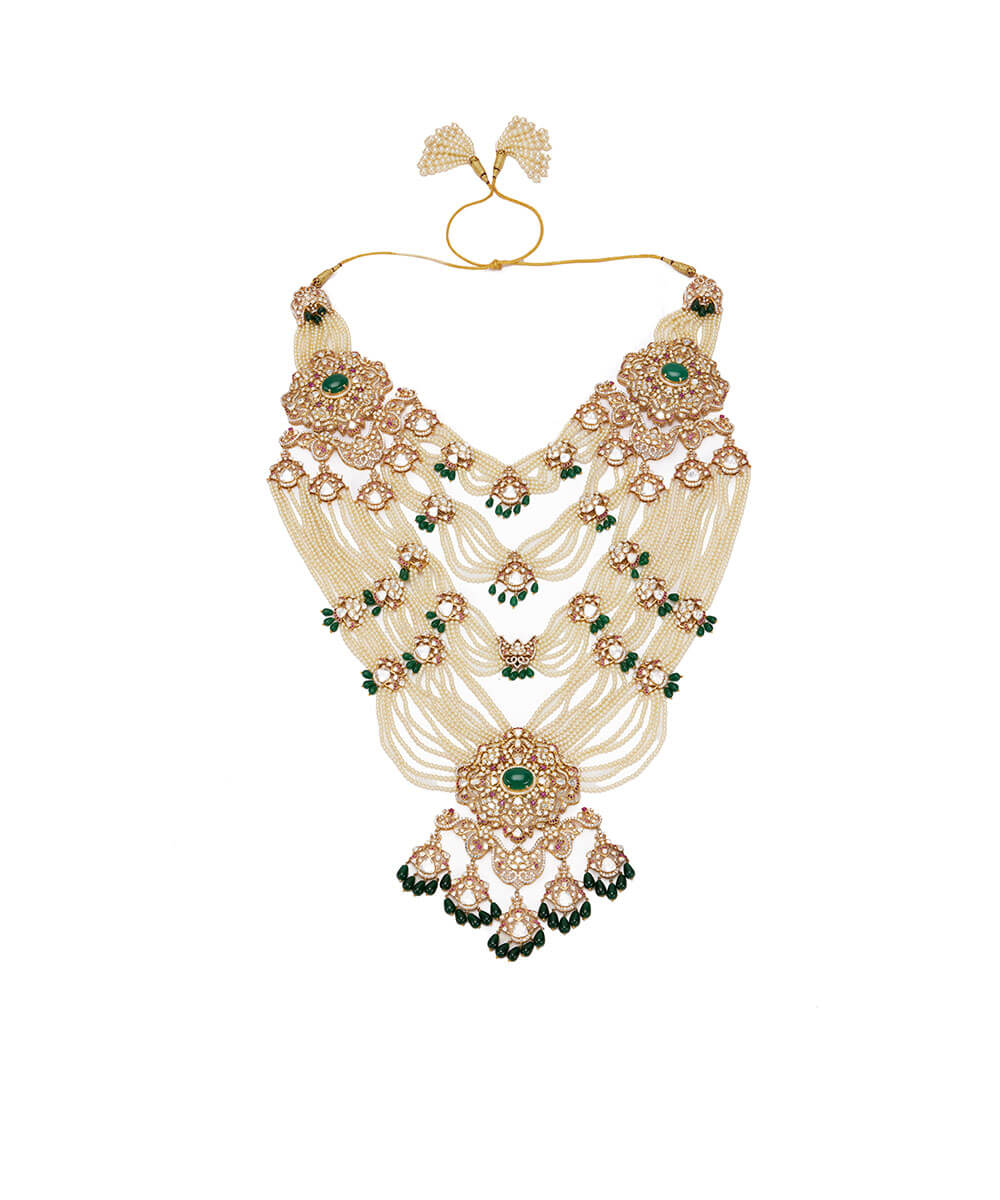 USP/Features: Made in sterling silver with micron gold plating, this necklace features a central emerald, polki, rubies, cubic zirconia, pearl strings, and a detachable design that converts into a passa or bun accessory.