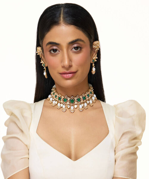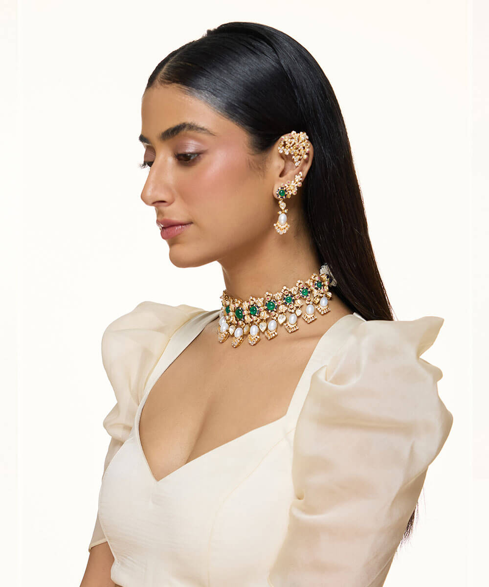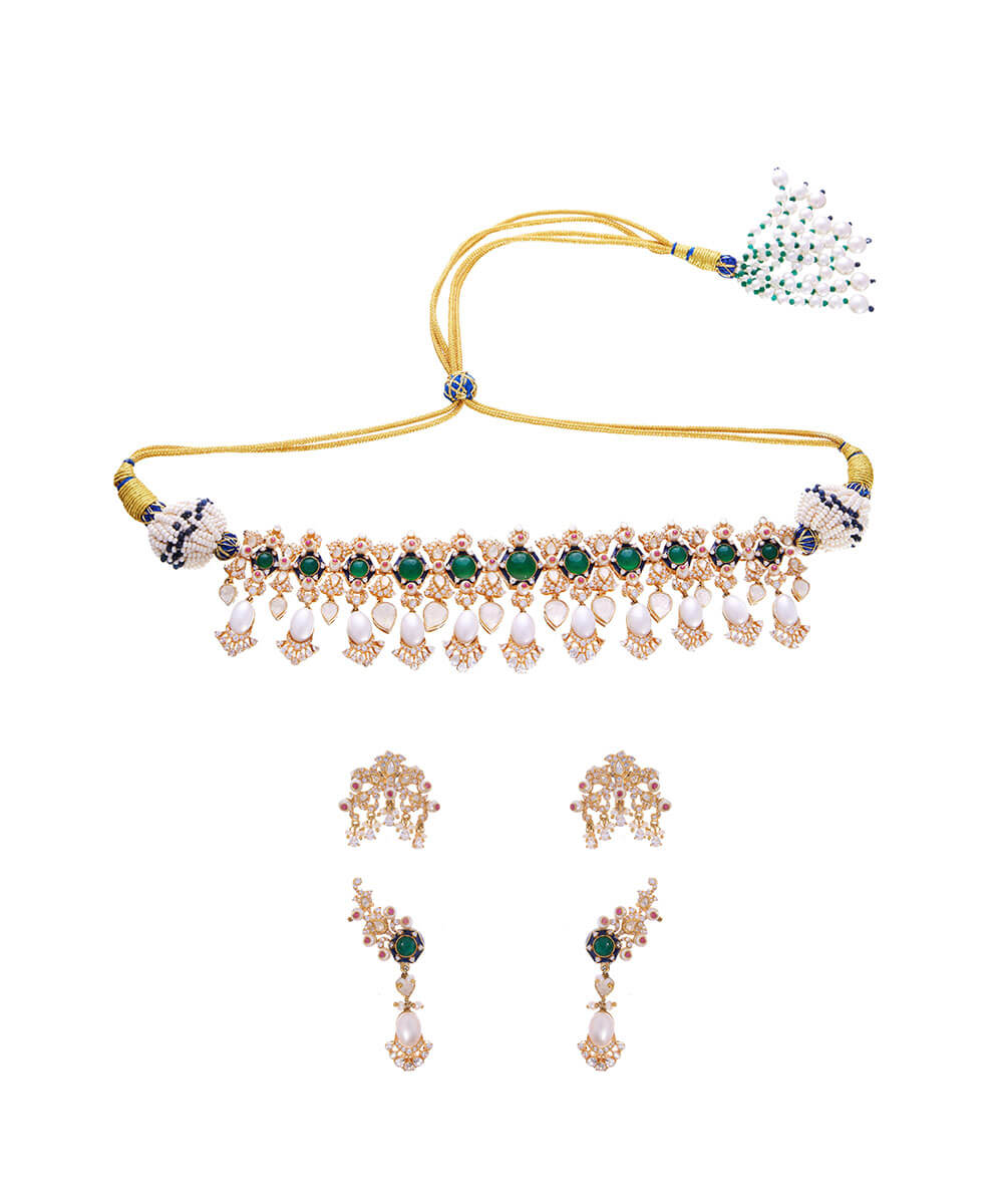 Choker Set Crafted in sterling silver, this regal set features polki, pearls, and rubies, elevated with bold blue meenakari accents for a timeless statement of elegance